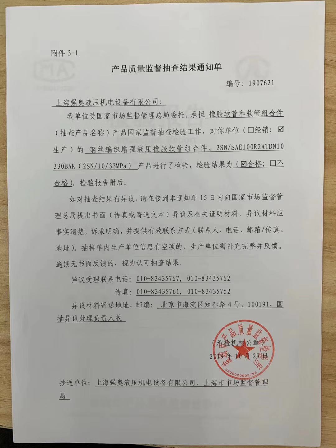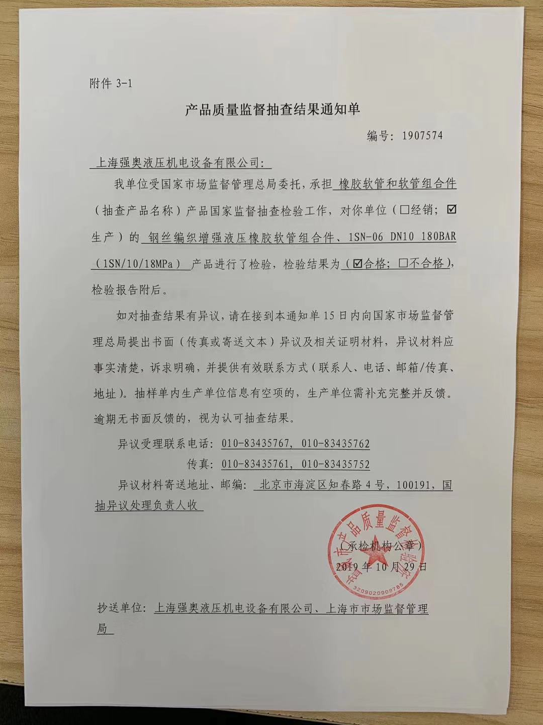 熱烈祝賀 上海強(qiáng)奧液壓機(jī)電設(shè)備有限公司 于2019年10月29日順利通過(guò) 國(guó)家市場(chǎng)監(jiān)督管理局 對(duì)我司2個(gè)批次的產(chǎn)品質(zhì)量監(jiān)督抽查!
